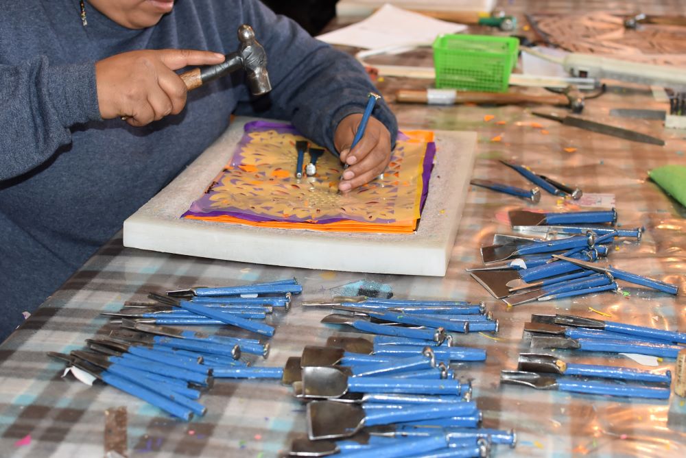Los artesanos primero crean sus diseños en una plantilla de plástico. Luego la colocan sobre una pila de entre cincuenta y cien hojas de papel tisú (o de plástico, papel metálico o cualquier otro material), de las que el artesano recorta el diseño utilizando cinceles de una colección de cientos de formas y tamaños diferentes, que empuja y corta en las capas inferiores con un martillo.