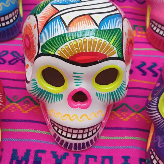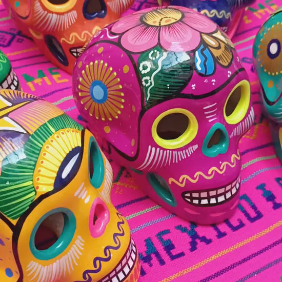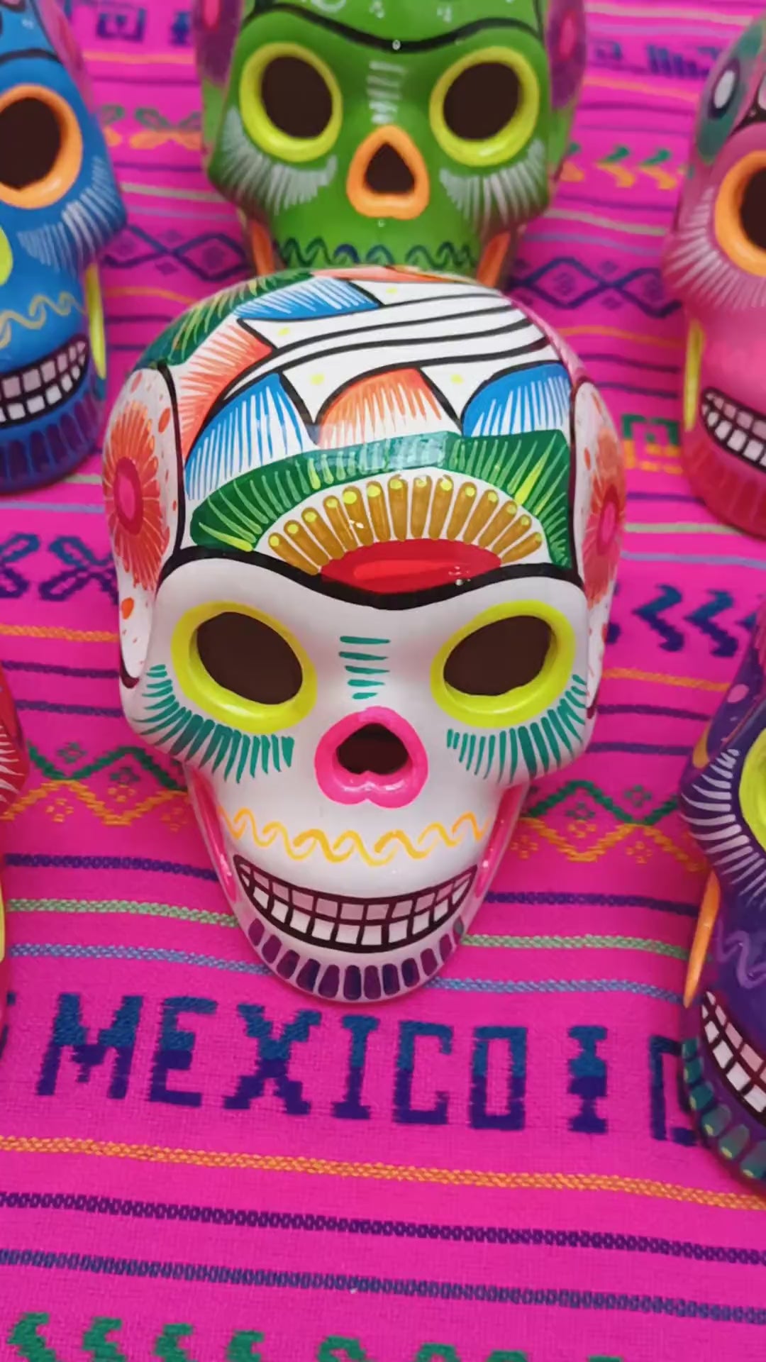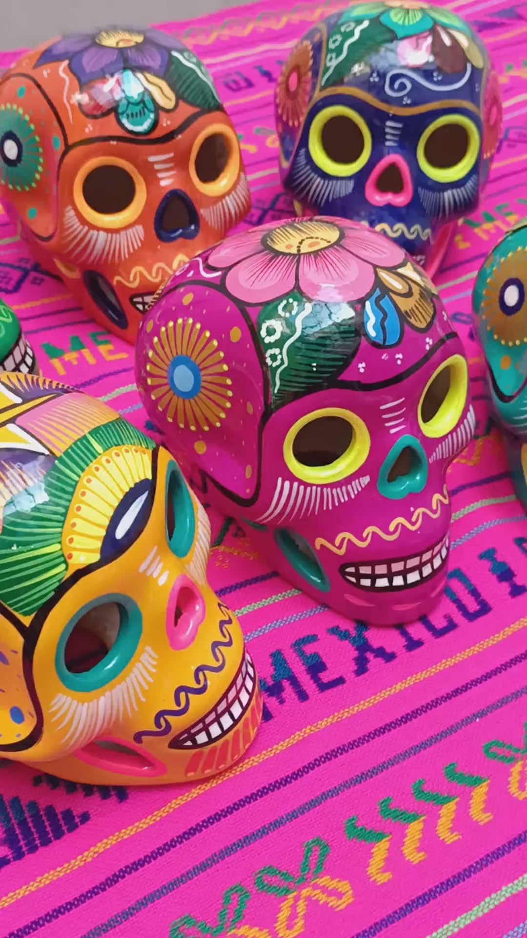 Mexican ceramic skulls wholesale Day of the Dead event decorations. Beautifully hand-painted with love in Mexico by a very talented Huichol artist and friend.