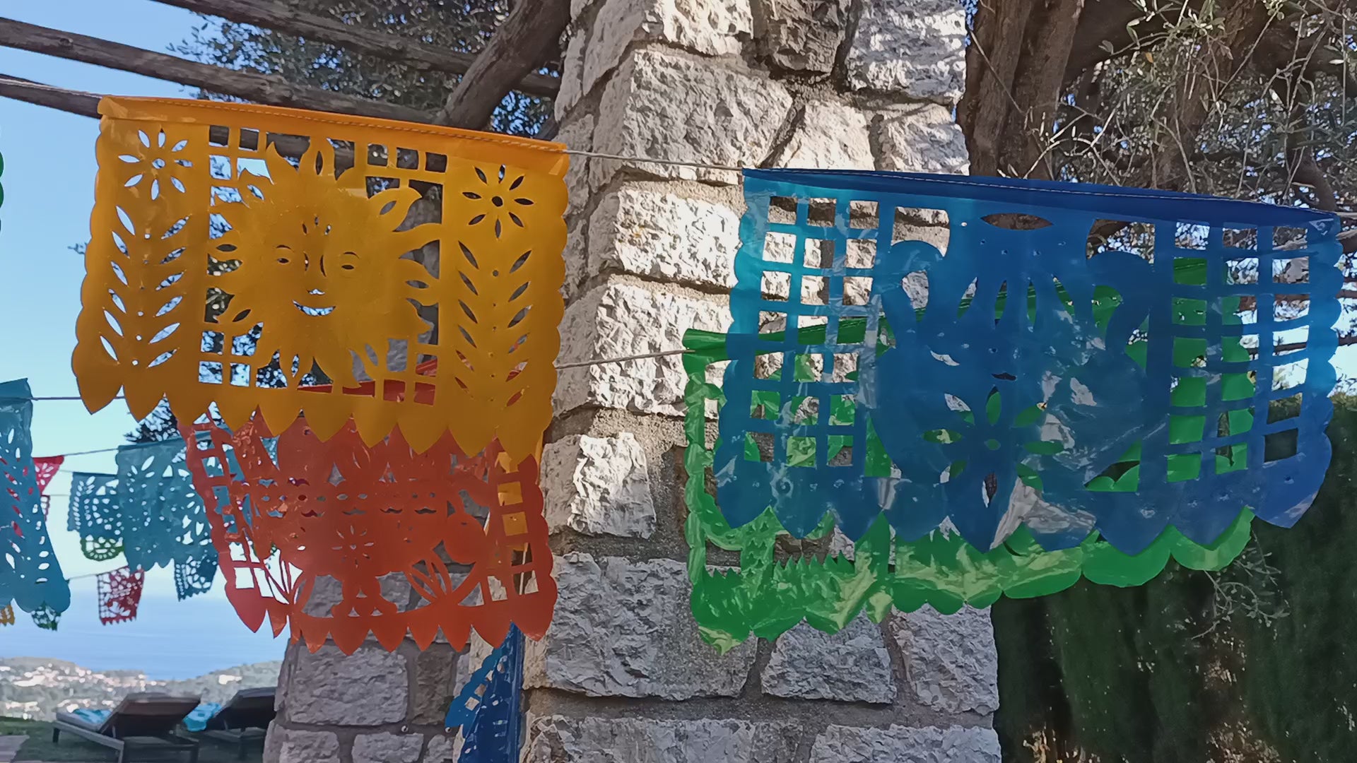 ★ Outdoor party decorations waterproof plastic bunting, Mexican papel picado garlands. Perfect outdoor birthday decorations, outdoor garden bunting decor, or for any kind of party or a Mexican themed fiesta.