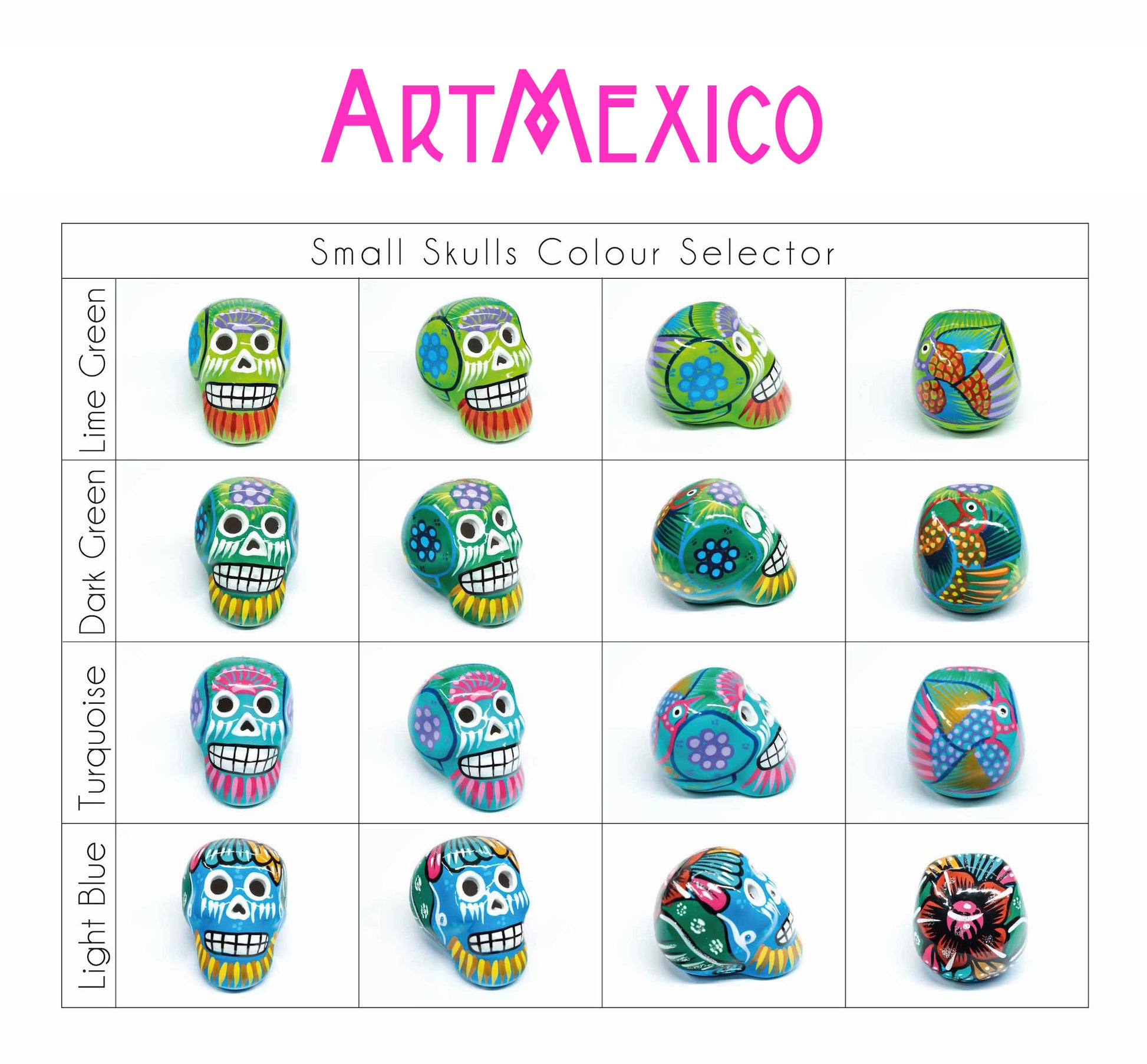 4 small ceramic skulls beautifully handmade in Mexico and shipped from our UK warehouse. Hand-painted with love by a very talented Huichol artist and friend of ours. These Day of the Dead inspired sugar skull ornaments make cheeky vibrant event decor!